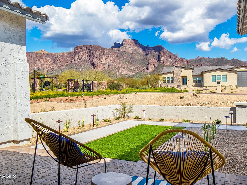 At the base of the mountains, surrounded in peace and tranquility, with forever views... is a new Move-In ready home in Arroyo Vista Estates, a gated community of 26 semi-custom homes by Bela Flor Communities, with unforgettable views of the Superstition Mountains. Over an acre lot, backing to a natural desert arroyo with many mature desert trees and shrubs! Paver courtyards front and back, and fully landscaped front yard. Approx. 2250sq ft, single level; Our Mediterranean elevation with contemporary desert colors, oversized windows and more! Side-entry, over-sized 3-Car garage plus a large workspace area; Over $120k in options and design upgrades and selections, including extensive 8''x36'' wood-look plank tile flooring, 42'' white cabinets with full height arabesque backsplash. 10ft ceilings, a 16 ft multi-sliding glass wall.