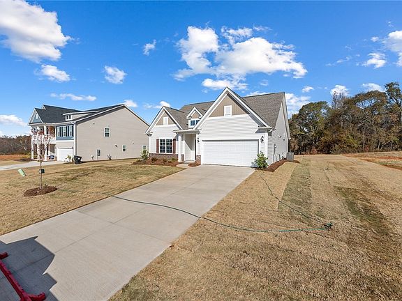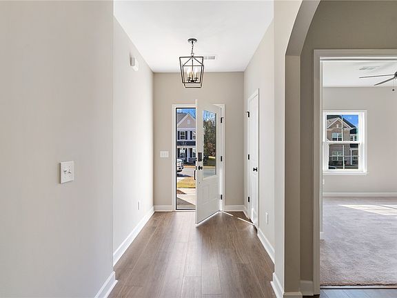 Enter through the front door and continue down the hallway to an open family room, and kitchen and eat-in area. A kitchen island with overhang to allow for more seating overlooks the family room. The primary suite is located at the back of the house away from the secondary bedrooms for added privacy. Continue through the primary bathroom to the walk-in closet with ample space. Two secondary bedrooms are located at the front of the house and share a hall bathroom. The laundry room is located off of the garage entry. A large guest bedroom with a half bath is upstairs.