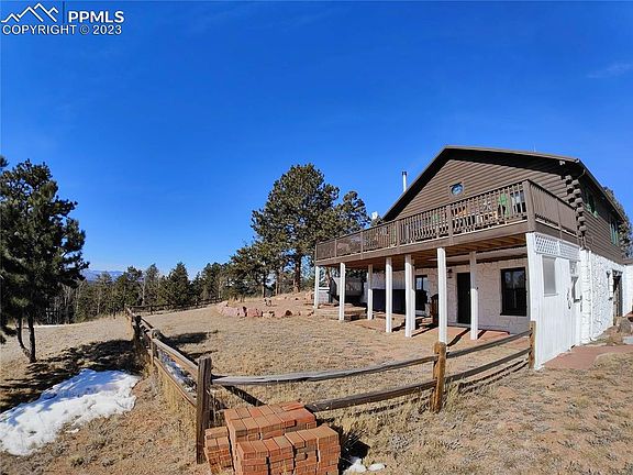 This cozy and tranquil log kit home on 6 private fenced acres with panorama Pikes Peak and Collegiate Peaks mountain views is the perfect mountain retreat. Soaking in your private hot tub under the milky way will take your breath away. Pike National Forest is within 2 miles of the house. This home is a log kit home with metal roof. The property’s private and fenced 6 acres allows for ample space for dogs and horses to roam. This property includes a 2 stall horse barn and 3 storage sheds. This updated home features a main living floor with an open kitchen, bright family room with large windows and a cozy wood stove. The main floor also has 2 bright bedrooms and 2 bathrooms along with a large wood patio deck with one of the best views in Teller County. The lower level has the main entry, access to the garage, a bedroom, a 2nd family room, laundry and a powder room. The oversized 2 car garage has generator hookup and work bench. The property has a gated private driveway, a 2 stall horse barn, 3 separate coops, dog yard and a second gate for horse barn entrance. 406 gal well has great pressure at .45 GPM. Well produces 648 gallons per day with good storage. Septic tank is concrete 1250 gallons with absorption trench leach field. The property has central heating and base board heaters. Unlike many properties in the area, there is no HOA. 2021-2022 updates include: New fridge, new range, new range hood, new washer and dryer, new hot tub, new engineered wood flooring, new interior and exterior paint, fire mitigation around house, radon vent, leak detection on main plumbing supply line, new wifi thermostats, security cameras and security lights. Furniture optional. Reconnect with nature and enjoy this tranquil retreat on top of the world.