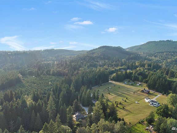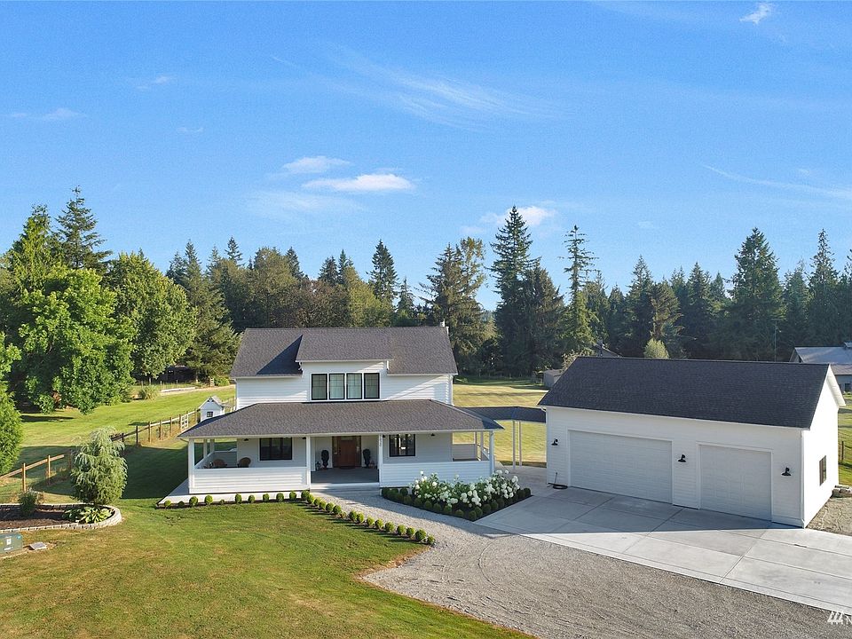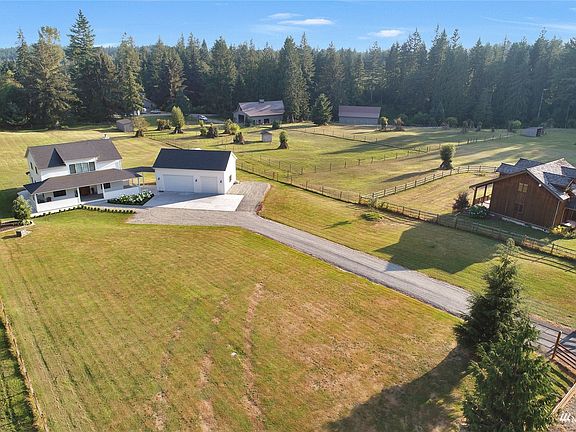 Fantastic 3 bed, 2.5 bath Farm-style homestead on 5 fenced acres! This home has been maintained w/ care & greets you w/ stunning curb appeal from landscaping to covered porch. Spacious, airy feeling home w/ 9ft ceilings has an abundance of windows plus dimmable lighting in every room. Open concept kitchen has substantial island, apron front sink, & gas stove top. Oversized slider leads to the back covered deck, looking out over the acreage. Upstairs features 3 bedrooms plus laundry room. Primary en suite includes vaulted ceiling w/ significant span of windows, generous walk in & luxurious 5 pc bath w/claw tub. Two more sizeable rooms include double closets. Detached garage provides ample space to park vehicles & toys. Quiet & Secluded!