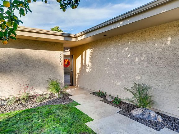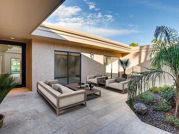 This exquisite lock & leave patio home has been meticulously updated just months ago, offering modern elegance and luxurious details throughout. Hardwood floors, hand-built double sided fireplace & a 9' custom barn door enhance the open living room with a vaulted ceiling, which flows into a gourmet chef's kitchen with quartz countertops, custom cabinetry, high-end SS appliances & access to the travertine courtyard. Close to everything: golfing, shopping, restaurants, bike trails. The perfect home or 2nd home with a 24/7 guard at the gate and the most luscious grounds Scottsdale has to offer.