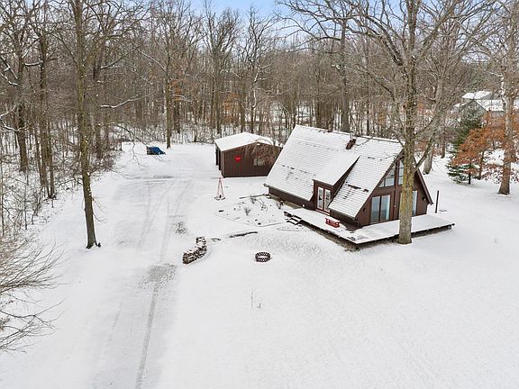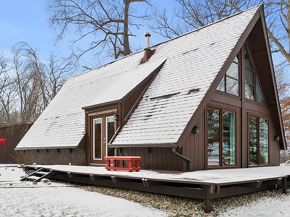 MULTIPLE OFFER DEADLINE: 2/19/24 3:00 PM. Quaint A-Frame home on a beautiful wooded setting! If you are looking for your own little oasis, this 2-bedroom home is situated on just under an acre is surrounded by mature trees and scenic views. Home has had almost all of the expensive items done for you in the last 4 years. New roof (2020), new furnace & a/c (2020), new flooring, fresh paint, new landscape rock, new sump pump, new windows, new kitchen cabinets (2022), and new wood burning stove & pipe. Some features of the home include wrap around porch, detached 24x28 garage, main level bedroom and main level laundry, cozy living room with tall ceilings and large picture windows, and full basement providing tons of storage space. This home is a hidden gem and has so much to offer for an affordable price! Be sure to check it out.