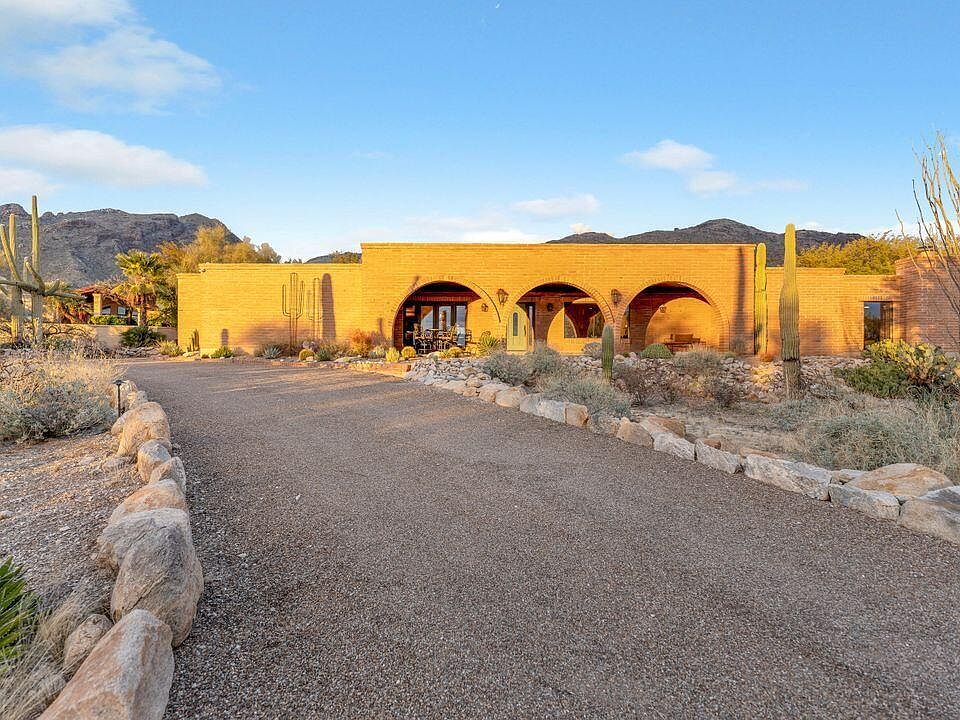 Welcome to your dream home nestled in the prestigious gated community of Sin Vacas, right in the heart of Catalina Foothills. This adobe brick, one-level residence boasts 4 bedrooms, offering a perfect blend of comfort and sophistication.As you step inside, you'll be greeted by the warmth of tiled flooring throughout, complemented by the breathtaking backdrop of the Catalina Mountains. Mountain or city view from almost every room. The thoughtful design and meticulous care are evident, with recent upgrades including two HVAC units 2021, pool heater, owned solar panels, and a home water filtration system.No interior steps, one level.The backyard is your private oasis, featuring a refreshing pool for those sunny Arizona days, a shady patio with gas fireplace for entertaining. The heart of this home lies in its spacious kitchen, equipped with high-end appliances, making it a chef's delight. Whether you're entertaining guests or preparing family meals, this kitchen is both functional and stylish.