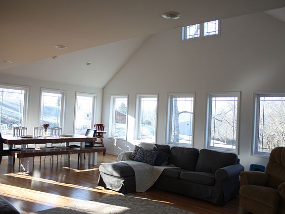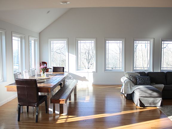 A traditional Cape Cod with wall to wall hardwood flooring almost entirely renovated, including an incredible vaulted ceiling great room addition with wall to wall windows and open loft to second story. -Main floor: 2 bedrooms, 2 full baths, kitchen, large den, great room -Second Floor: 1 extra large bedroom, loft and playroom that could also be turned into 4th bedroom -Lower Level- unfinished basement with extensive storage space and laundry room with 2 car garage with space for additional storage 2 Exterior buildings/barns with much potential for workshop/studio, etc. 10 acres of land with wooded hiking trails, a pond with new dock, large playground and incredible views of the valley below. Land also great for hunting. Additionally, foundation completely redone in 2011, new HVAC system in 2011, custom railings and bookshelves throughout