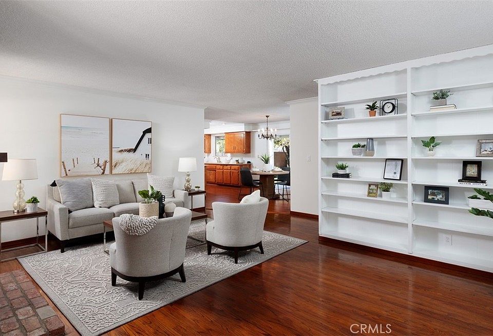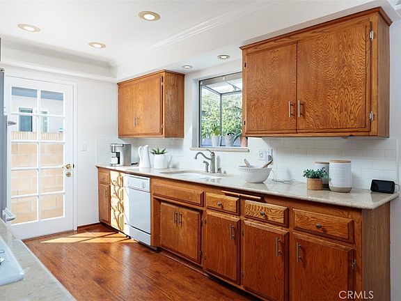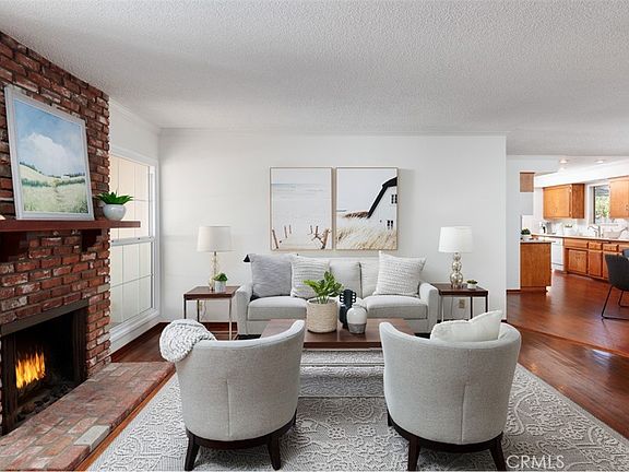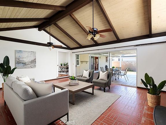 Welcome to your dream retreat in Sol Vista. Presenting a charming haven this expanded residence is making its debut on the market offering a lifestyle of comfort and convenience. Step into a spacious floor plan spanning 1808 sq ft where an additional entertainment space spills out through sliding glass doors to a covered brick and concrete deck, seamlessly extending to a sprawling private backyard. Warm up by the second fireplace nestled amidst spill-proof Saltillo tile flooring and beneath a high wood-beamed ceiling creating a cozy ambiance for winter get-togethers. A roomy galley-style kitchen adjacent to the dining area has been modernized with quartz counters and wood laminate flooring. Cook to your heart’s content with a gas four-burner cooktop and dual ovens, while the light-filled garden window above the sink offers a picturesque spot for growing fresh herbs or orchids. The raised foundation home boasts original wood floors in the bedrooms and living spaces. Of the four bedrooms one is currently utilized as an office, providing flexibility for your lifestyle needs. The original living room features a gas fireplace and deep windows overlooking the front courtyard while a wall of built-in shelving provides storage and easy access for books, memorabilia and collectables. The roomy hall bathroom has a tub and shower while the main bathroom has a brand new walk-in shower. The two-car garage, complete with additional built-in shelving, is adjacent to a separate laundry room equipped with laundry tub and drop-down laundry-folding table along with included washer, dryer and fridges in both the kitchen and garage. Outside enjoy landscaped front and back yards with sprinkler systems, mature fruit trees and high hedges providing privacy. Bask in the sun-drenched seating area of the enclosed front courtyard, surrounded by established neighborhood charm with large street trees. Conveniently located near Bella Terra Mall, the 405 freeway and pristine beaches, this home offers the perfect blend of tranquility and accessibility.
