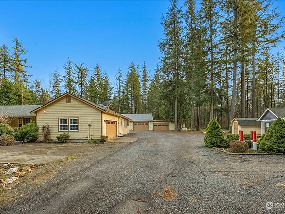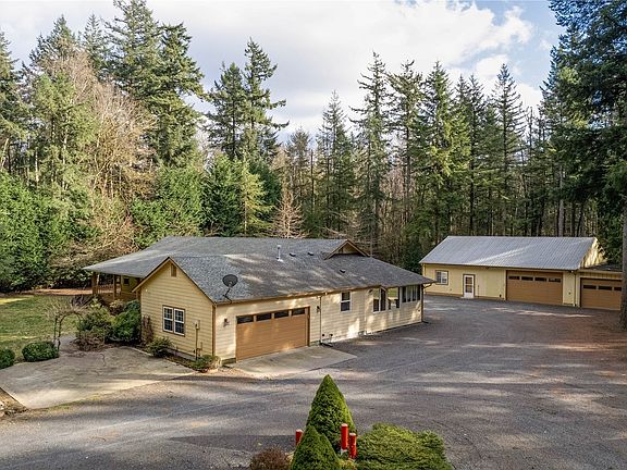 Trees, privacy, and brightness - hard to find in one property but your search is over. Just an exquisite home layout for a one-level county home minutes from town. You will appreciate the large large primary w/ ensuite, 2 guest bdrms, dedicated laundry space w/ sink, mud room, enclosed porch, vaulted ceiling in Great room, dining room, and 2 car garage w/ generator hookups. In addition the property enjoys a wide sunny building envelope with tall, beautiful, high-limbed evergreens. The large 48'x36' & 32'x36' shops have compartmented spaces, one w/ woodfired heater. Two additional outbuildings for use as well. Private well with filtration for the home, and a shared well for irrigation.