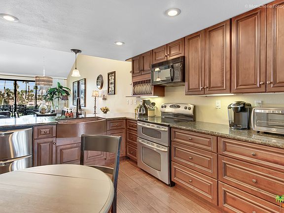 Fantastic updated open floor plan 2 bedrooms, 2 baths plus den Palm plan is being offered furnished. The spacious kitchen is a WOW with the cooper farm sink, stainless steel appliances, beautiful cabinets and granite counters. The wood like floors provides a clean look throughout the property. Outdoor living space offered on two patios that provide views of the golf course. Perfect desert getaway offered at Palm Valley Country Club with two 18-hole golf courses, tennis, pickleball, fitness center and health spa. This is a gem not to be missed.