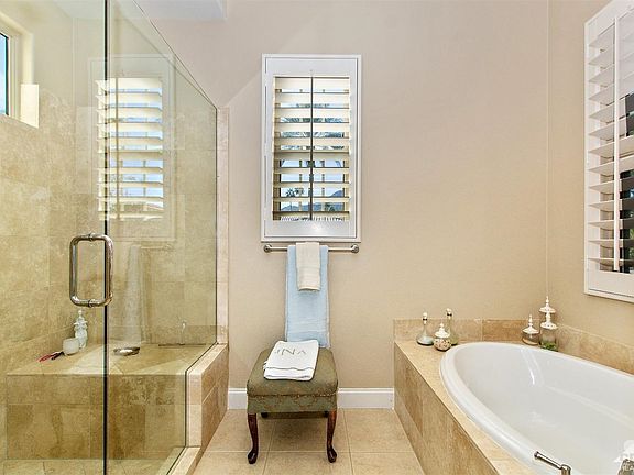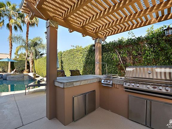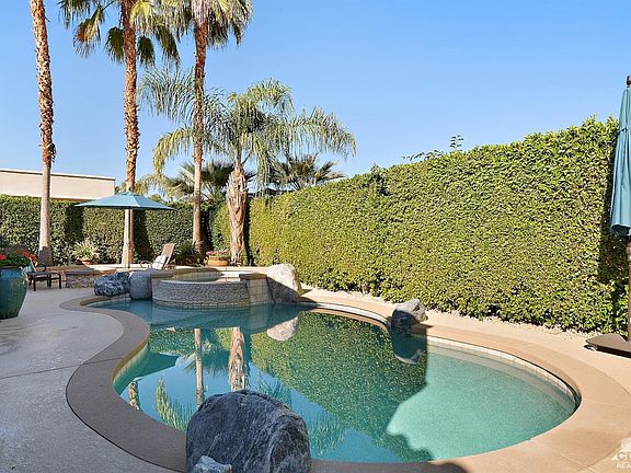 This Montelena home is in a private gated community in Indian Wells. Located in the heart of the Valley, close to shopping restaurants hotels and golf courses, this one is a jewel. It has been impeccably maintained, and upgraded. You will find it perfect for indoor/outdoor living and entertaining. A new BBQ area has been added by the pool in addition to a fire pit near the spa. Also, you will find a unique office/workout room near the pool area. The master suite is separate from the other bedrooms and has an entertainment center of its own. The master bath is all done in travertine and has a tub and walk in shower. A new garage door has just been added and the garage floor is almost too beautiful on which to park a car.