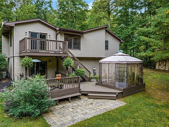 Wonderfully updated 3 bedroom, 2 1/2 bath home on a private 2 acre lot includes a spacious 32x40 building with room for all your toys! This lovely home boasts an updated kitchen with granite countertops and new LVT flooring, large great room w/fireplace and newer carpeting and opens to the multi-level decks, master bedroom with multiple closets and master bath w/jetted tub and walk-in shower, and family room in lower level w/wet bar and adjacent half bath/laundry area. Step out back to the outdoor oasis with multi-level decks and gazebo overlooking private back yard. Some of the many updates include upper level carpeting '22, roof 6 yrs; furnace 2 yrs; dual tank water softener w/carbon bed filtration '22; granite in kitchen & 2 baths; LVT flooring in kitchen, bedroom, & master bath; most light fixtures throughout home in past year, and much more. The icing on the cake is the 32x40 building with it's own driveway, 3 garage bays, 100 amp electric, water run but not hooked up, and loads