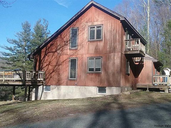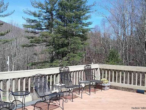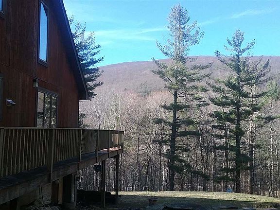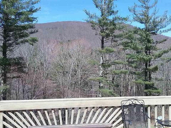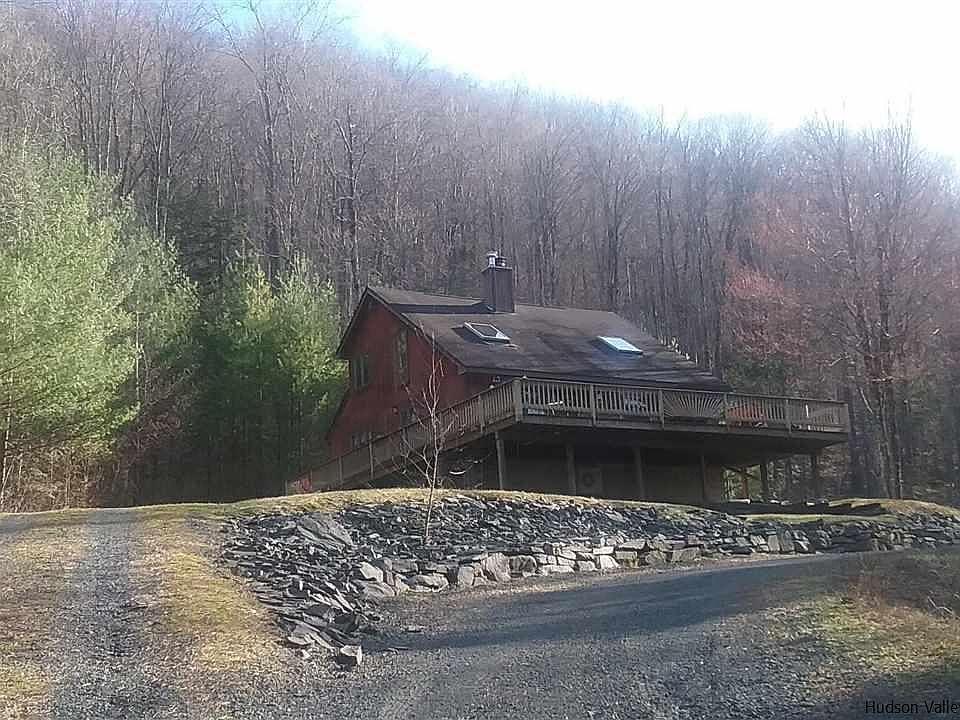 14 ACRES OF MOUNTAINSIDE PRIVACY in HEART OF THE CATSKILLS! Located near BIG INDIAN, N, just 2 hrs from Metro area, this 1500 Sq.Ft., 3 Bedroom, 2 baths contemporary home with a huge wrap-around deck overlooks the surrounding mountains. Great entertaining space inside and out! Featuring an open floor plan with vaulted living room ceiling & skylights extending over 2nd floor balcony the 1st floor includes living room with fireplace and 2 sets of sliding doors to expansive deck; a large kitchen with island counter facing living/dining area, closeted laundry, pantry and separate coat closet plus a 1st floor bedroom and full bath, accessible from two entries. Two additional bedrooms upstairs with an adjoining bath accessible by each bedroom. The two sets of sliding doors on living room front provide majestic view of valley mountains. Full (dry) basement of poured concrete walls with partitioned garage. Remaining large dry basement area with standard ceiling height has potential for finished rec room. Totally private, yet close to the best of The Catskills: major ski areas, vast network of state hiking trails, fishing & hunting, restaurants and inns.