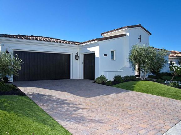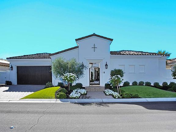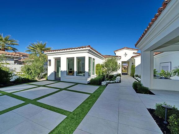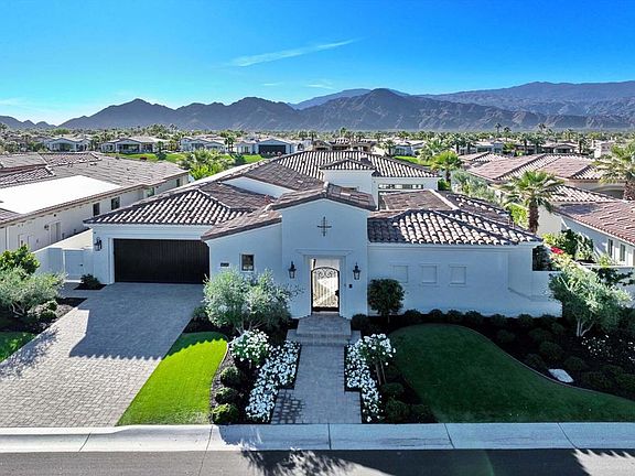 This highly custom Plan 631 inside Toscana Country Club offers stunning views of the lake, desert mountains, and Jack Nicklaus Signature Golf Course. Built in 2021, this exquisite home's finishing details include custom architectural upgrades, wood flooring throughout, enormous pocket doors that blend indoor-outdoor living, large covered patio with fireplace and entertainment center, contemporary lighting and chandeliers throughout, contemporary wallpaper and modern wainscoting for high-end wall design, custom built-ins, custom pool & spa, firepit, outdoor grill, and more.The gourmet kitchen provides ample storage with white shaker cabinets and huge black center island; the kitchen also includes a breakfast bar peninsula, spacious range nook with quartz-wrapped hood to match the countertops, SubZero Wolf appliances including a wine refrigerator and panel-matched refrigerator, and double-wide French doors that lead to the expansive courtyard.The primary bedroom features a modern fireplace and and en-suite bath that offers double vanities, His & Hers walk-in closets, freestanding soaking tub overlooking a picture window, glass-wrapped rain shower, and leathered satin marble countertops. Guests can relax in either of the two main-home guest rooms - each with their own immaculately appointed en-suite baths, or the private guest house that offers separate living room and bedroom, en-suite bath, and entertainment center over the kitchenette.