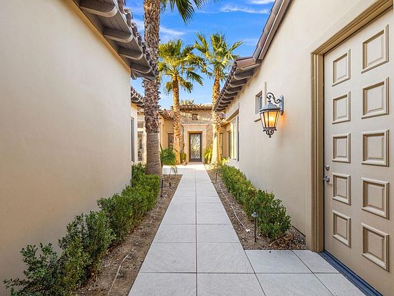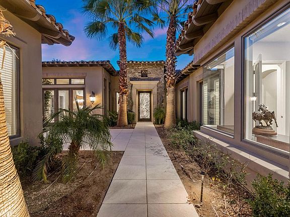 Experience the epitome of desert luxury in this beautifully reimagined 4,064 sq. ft. residence at Toscana Country Club, showcasing over $600,000 in designer-led renovations. Currently offered at the lowest price per square foot in the community, this home presents an extraordinary opportunity to own a refined retreat with timeless sophistication.A seamless blend of transitional and contemporary design defines the interiors, where wood-inspired plank flooring, matching granite and quartzite surfaces with dramatic waterfall edges, and thoughtfully curated finishes set the stage. The open courtyard welcomes with a putting green, firepit, and dual sets of triple-pane doors that invite natural light and effortless indoor-outdoor living.The expansive great room is designed for both grand entertaining and intimate gatherings, featuring dual pocket doors framing double-fairway views of the Jack Nicklaus Signature Golf Course, a statement fireplace with adjacent wet bar, and multiple sitting areas.The chef's kitchen is a true showpiece, anchored by an impressive L-shaped waterfall island with breakfast bar, modern wood-grain cabinetry, pot filler, and top-tier appliances including a panel-matched refrigerator, dual ovens, professional-grade range and hood, and a full-size wine refrigerator.Retreat outdoors to enjoy a private spool with water feature, a second firepit, and serene spaces to savor desert evenings.The master suite is a sanctuary, complete with a spacious bedroom and private lounge. Its spa-inspired bath features dual waterfall-edge vanities, a quartzite-wrapped soaking tub set against a custom feature wall, and a glass-enclosed shower with luxurious stone finishes.Two additional guest suites (one currently used as an office) and a detached private casita with kitchenette provide comfort and privacy for visitors.This exceptional residence balances refined elegance with modern amenities, including solar, creating the ultimate desert lifestyle at one of Indian Well's most prestigious addresses.