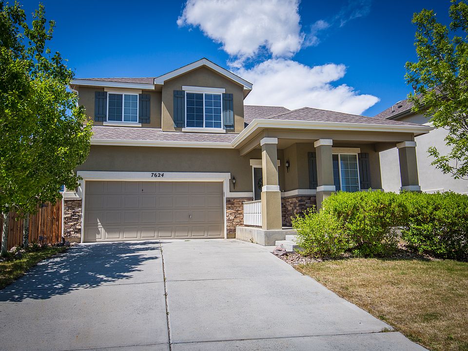 Beautiful 2 story home located in Mesa Ridge* Very convenient location that is just a few minutes away from Fort Carson and shopping amenities in the area* Schools are close by and there is a park within walking distance* Exterior is fully stuccoed and stone providing easy maintenance for years to come. Fully landscaped front and back* Backyard has an oversized concrete patio and numerous fruiting plants* As you enter the front door you will be amazed by the gorgeous hardwood floors that flow throughout the formal living room and into the Dining room/Kitchen area* The Family room has a cozy gas fireplace perfect for winter* Gourmet Kitchen has desirable Granite Countertops, Oven with a built in toaster oven, large pantry, and island* The Dining nook off the Kitchen has a possible breakfast bar off the island and walks out to the backyard* There is a convenient half bath located off the garage as well as a large laundry room with plenty of cabinets for storage and a sink* Going upstairs you have a nice sized loft perfect for an office or even a 2nd family room* There are a total of 3 bedrooms upstairs* Master adjoins to a walk in closet and 5 piece bath that has ceramic tile flooring, free standing shower, soaking tub, and double vanity* Additionally there is another full bath in the upper level hallway* Whole house has central air which will be perfect for this upcoming summer* For plant/garden lovers, you will find 3-Raspberry, 3-Blackberry, 1-blueberry,16 total Strawberry. Also Zucchini, Tomatoes, Pumpkins & Lettuce planted. Asparagus will be removed.