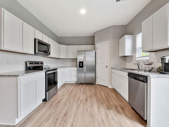 Zero entry, 4 bedroom, 2 bath open floor plan. Home has safe room in the garage. Interior of home has granite counter tops, pantry in kitchen, luxury vinyl flooring, all appliances stay. Exterior of home has a 30 year roof, gutters, concrete siding, sprinkler system and wood fence. Great location.