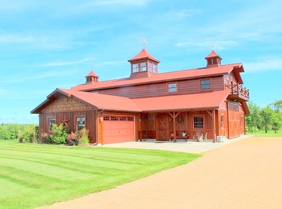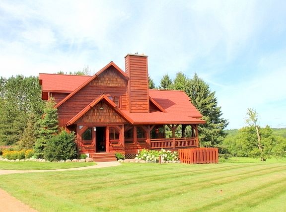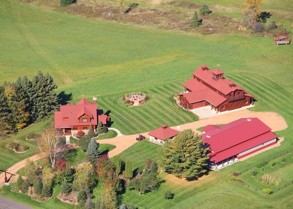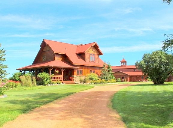 SHOWPLACE HORSE FARM, RANCH SET INTO A MAGNIFICENT 275 ACRE NORTHERN WISCONSIN SETTING, west of Butternut. A stunning 3014 square foot, 1.5 story custom cedar home is located on a beautifully landscaped hill with the most pastoral rolling meadows and hardwood forest panoramas. There is a gorgeous 38 by 72 4 stall horse barn with tack & feed rooms, attached 2 car garage, second floor hay loft & efficiency apartment with balcony.