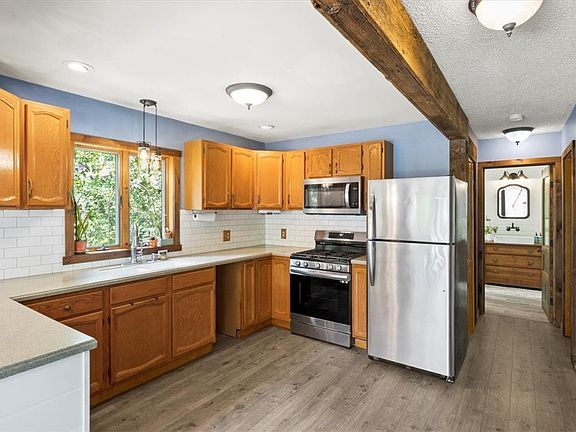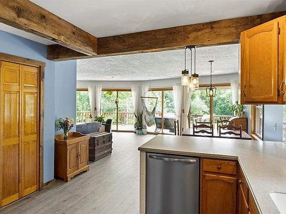 If you’re looking for a serene escape w/ plenty of privacy, this is the place for you. Nestled on just over 13 acres of land, this home has a park like yard, bordered by Salmon Creek which offers unparalleled tranquility & natural beauty. The wrap around deck offers the perfect space to relax & take it all in. Watch the wildlife, listen to the stream run, & unwind after a long day. Enjoy privacy while being mins from Sodus Point & beach. The inside space has been transformed from top to bottom over the years. With 5 bedrooms & a finished walk out lower level, you have all the space you could need. The kitchen was opened & new flooring throughout, so the main floor has an open & modern feel, flooded with natural light from multiple sliding glass doors. Main floor bathroom updated in 2021 includes a luxurious soaking tub overlooking the serene private side yard. Walkout finished basement includes a 1/2 bath & office space. Use for extra living space or transform into your dream primary suite! Side yard fenced in 2017 & outbuilding perfect for animals built in 2019. Maintenance free metal roof 2016 & HVAC 2014. This home has it all & more! Sqft per floorplan
