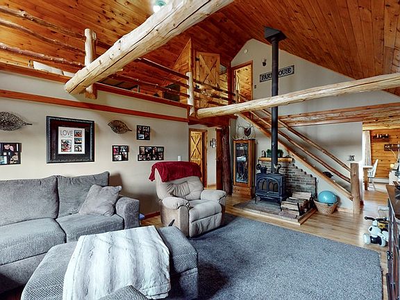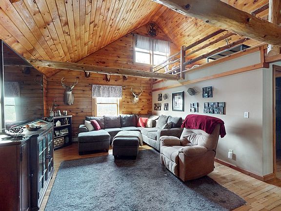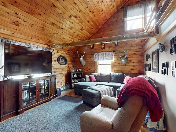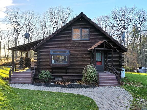 TAKE A RETREAT TO THE FINGER LAKES REGION IN THIS GORGEOUS LOG HOME nestled on 14+ acres! This stunning home features 4 bedrooms plus a bonus room, 1.5 baths, open kitchen/dining concept, beautiful wood throughout, living room features cathedral ceilings open to the second story loft. The lower level was recently finished to give you additional space to enjoy! Outside you will find a 2-story barn/garage with electric, heat, and an added back room. A front porch, walking & riding trails through the private woods, even an adorable hunting cabin located in the back! YOU WILL FALL IN LOVE!