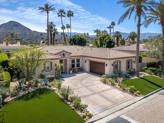 Find everything you've been looking for in this 3 Bedroom, 3 1/2 Bath home in the coveted Indian Wells gated community of Montelena. Premium South facing lot in this community of 74 homes. Private outdoor living area boasts a PebbleTec pool & spa, built in BBQ and outdoor bar area with remote controlled awning, outdoor misting system, ceiling fans, gas fire pit, flat screen TV, outdoor lighting, and surround sound speakers throughout the pool & patio area. Inside, high ceilings accentuate an open floor plan, open kitchen with center island, granite countertops, gas cook top and views to the outdoors. Other features include porcelain plank flooring, fireplace in family room, updated bathrooms with dual vanities and custom window coverings. Walk in shower and closet in master bath. Plenty of storage. Low maintenance yard with artificial turf to save on gardening and water. With an Indian Wells resident card, you can enjoy select discounts at the Indian Wells Golf Resort, BNP Paribas Open and all four Indian Wells resort properties. One of those properties, the Tommy Bahama Miramonte resort, can be accessed from a private walking gate within Montelena! Close to shopping, casual and fine dining, Eldorado CC, Vintage CC, Desert Horizons CC, Toscana CC and El Paseo with easy access to all major freeways.