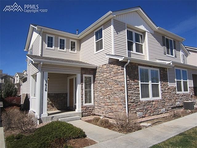 Beautiful end-unit townhome with two master suites, attached 2-car garage and central A/C! Gorgeous hardwood flooring throughout main level sets off roomy living room with dining area plus attractive kitchen with well-planned layout. Upper level offers master bedroom w/vaulted ceiling, walk-in closet & full bath w/tile floor. 2nd master includes full bath w/tile floor & walk-in closet. Upper level loft is perfect for office, family room, or play room. Close to Ft Carson; easy drive to Peterson AFB. See this one today!