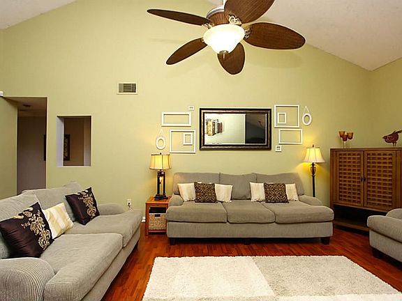 Absolutely GORGEOUS 4 bedroom home with high ceilings and tons of updates!! Beautiful laminate wood floors in living room and all bedrooms. All the other rooms have tile...no carpet in the home! This home has 2'' faux wood blinds throughout, updated lighting, crown moulding in the master and dining, a brick fireplace, updated master bath and a covered back patio overlooking a great sized backyard! The water heater was replaced in 2011, A/C coils in 2007 and furnace in 2008. Refrigerator stays!