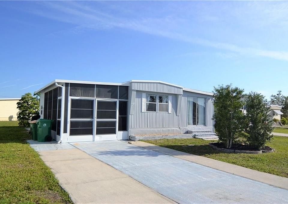 Two 2 bedroom 1-bathroom home Home features wood laminate flooring throughout and has been re-painted inside. Kitchen has plenty of cabinet/counter space, pantry closet and is open to the large dining room area and living room. Nice size Master Bedroom with two closets and built in dresser and master bath with walk in shower. There is an additional room that could be used as a second bedroom or maybe office/sitting room. The Village of Holiday Lake boasts 20 boat slips (with more to come) with access to Charlotte Harbor and the Gulf of Mexico through the lock system. Beautiful pool area boasting 2 pools and BBQ area. There is always something going on for everyone at the large recreation hall with full kitchen, craft room, laundry facility along with areas for woodworking , tennis, shuffleboard and more. Golf Carts welcome. Great winter get away spot. NOT a 55 and over community and low HOA. This property did receive some Hurricane damage. There is a broken window, Roof damage in the small bedroom, some wind damage, some mold in dining room ceiling and the lanai is gone. Appears to be repairable but recommend an inspection.