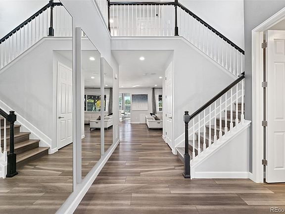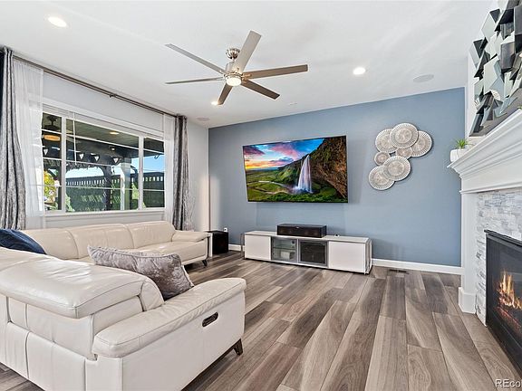 Serenity Ridge stunner! This spacious home features 7 bedrooms, offering plenty of room for everyone, and filled with high-end finishes throughout. The grand open floor plan is beautifully enhanced with durable LVP floors, flowing seamlessly into the cozy living room with a stacked stone fireplace and built-in bookshelves. The gourmet kitchen is a chef’s dream, boasting quartz countertops, a farmhouse sink with a pull-down spray faucet, a desirable 5-burner gas cooktop, and an expansive walk-in pantry. You'll love the ample white cabinetry and dazzling glass hexagon tile backsplash, along with the large center island perfect for casual meals. The bright formal dining room, flooded with natural light, opens to the private backyard oasis. A mudroom off the garage provides practical storage and convenience. The main level includes a guest bedroom and nearby bath. Upstairs, discover three generously sized bedrooms, a spacious loft, and the primary suite, which offers a luxurious spa-inspired bathroom with an oversized walk-in shower and pebble stone flooring. The upper-level laundry room adds to the home's functionality. The fully finished basement provides even more living space, with a large family room, three additional bedrooms, and a full bath. The backyard is an entertainer's paradise, featuring built-in stone bench seating around a fire pit, lush plants, a serene pond with a waterfall and charming bridge, and low-maintenance artificial turf. Recent upgrades include a new Chase Drain, ensuring worry-free outdoor enjoyment. With no neighbors behind, easy access to E-470, Aurora Reservoir, shopping, and dining, this move-in-ready gem offers everything you need for comfortable and stylish living.