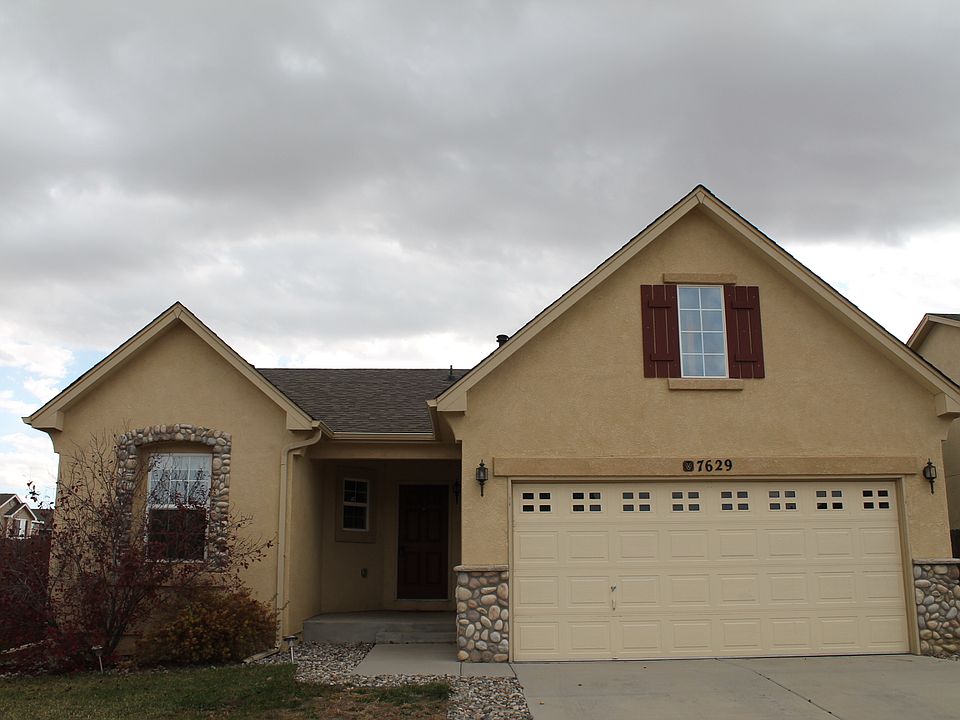 Stucco ranch style home on a large corner lot! Open floor plan w/ spacious kitchen including stainless steel appliances, counter bar & lots of cabinet space that opens to the dining area & great room. The Great Room has a cozy gas fireplace that walks out to a fully fenced yard w/ a stone patio that makes great outdoor entertaining space. A large master bedroom & adjoining bath, 2nd bedroom, office, laundry & powder room complete this main level living home. Convenient location close to military bases, shopping and I-25.