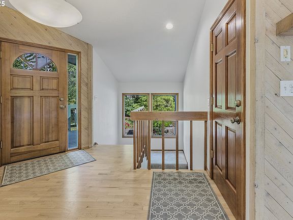 Discover the latest upgrades to this stunning property, which include wide oak luxury vinyl plank flooring, plush new carpet in the living room, stairs, and loft, fresh interior paint, and updated lighting and fixtures—all enveloped by natural beauty. Nestled down a gated private drive, the house is set back from London Road in a parklike setting surrounded by mature landscaping and a variety of fruit trees. Even though you’re just minutes from downtown Cottage Grove, local schools, and Interstate 5 you’ll relax in your own private 5 acre haven. The main level boasts vaulted ceilings, hardwood flooring, and expansive floor-to-ceiling windows that allow abundant natural light to flood the space, enhancing the stunning views of nature's beauty throughout the changing seasons. The lower-level primary suite features elegant French doors opening onto a flower and herb garden in the backyard. The en suite bathroom is equipped with double sinks and a custom Italian tile shower. This level also includes two additional bedrooms with an updated Jack and Jill bathroom, complete with a charming clawfoot soaker tub and an imported Italian silver leaf mirror with a matching shelf. The loft area, with built-in bookshelves, offers extra personal or social space with a sweeping mountain view. Recent upgrades include a new heat pump (2023), a new electrical panel (2022), and new, just installed light switches and outlets throughout the house. A whole house generator that starts automatically with a 500-gallon propane tank. Also new are the recessed LED ceiling lighting, fiber optic high-speed internet connection (2022), and brand new exterior paint. Additionally, the property includes a digitally controlled Culligan Water System. The exterior features a spacious deck surrounded by well-established landscaping and is perfect for entertaining. Exit the back gate for a short nature walk to Cottage Grove Lake. Only 20 miles to Eugene. Call your agent to schedule a showing today!