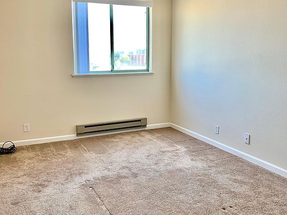 This updated 4th-floor unit has an open floor plan with carpeting throughout. Cozy kitchen with granite countertops, new refrigerator and tile flooring. Primary bedroom boasts 2 roomy closets that lead to the connecting bathroom with granite countertops and shower over tub. Washer & dryer are conveniently tucked away in the entry closet. This commuter haven is nearby to Jack London Square and Old Town Oakland. Enjoy restaurants, shops, theatre, the farmers' market, and more. Just a few blocks from BART and freeway access.