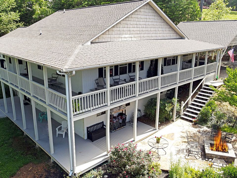 Stunning landscaping with a view on this 3 bedroom/3.5 bath home. Beautiful dry stacked stone retaining walls, beautiful flowers, amazing fire pit with stone patio, and remote controlled water fall. The home has 3 master suites with one being on the main floor and 2 more in the basement. The beautiful kitchen has granite countertops, tile backsplash, and pull out cabinets. The main floor master bedroom has an enormous closet with custom shelving. Moving down to the finished basement you will notice the wide stair case, enormous living room with additional kitchen area. Trex decking on most of the porches. A huge oversized carport connected to the house with an additional detached one car garage. Hot tub and pool table stay with the property. The home has a dual fuel HVAC system and the roof is only 3 years old. You are less than 3 miles from downtown Blairsville but this lot is very private.