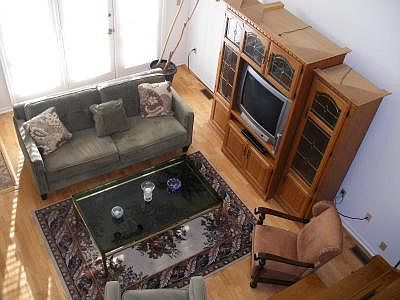Spacious 2 bedroom townhome ; open floor plan; cathedral ceilings, hardwood floors; two sided woodburning fireplace, Mbr with jacuzzi and shower; open loft area for office or relaxation; eat-in kitchen; large unfinished basement awaiting your personal touches; spacious deck for outside entertaining. Outside fresh paint.. Townhouse complex is readily accessible to all major routes and shopping.