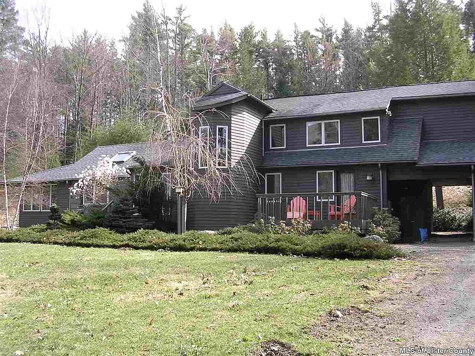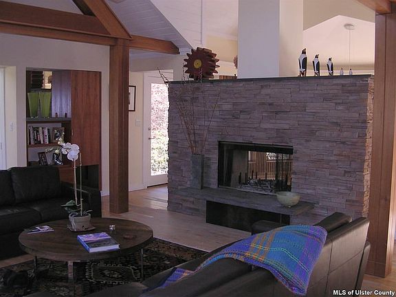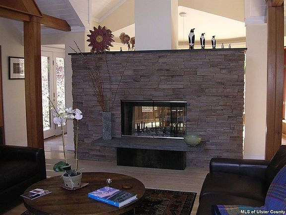 WOODSTOCK Architect Designed Contemporary. Spacious sunny living/dining w/double bluestone FPL, gourmet kitchen opens to deck for entertaining, den w/pocket doors for extra sleep space, 2 bedrooms w/baths on main floor, second floor master w/full stone tile bath and steam shower plus full dressing room and additional room for office or sleep space and doors to deck to pool. Multiple decks and bluestone steps lead to a large heated in-ground pool and pavilion kitchenette and hot outdoor shower, all with sweeping mountain and pond views on almost 11 landscaped acres bordered and protected on 3 sides by Wilson State Park for privacy and hiking trails.