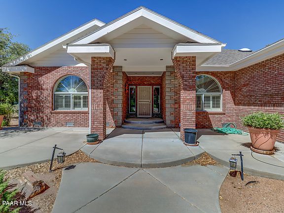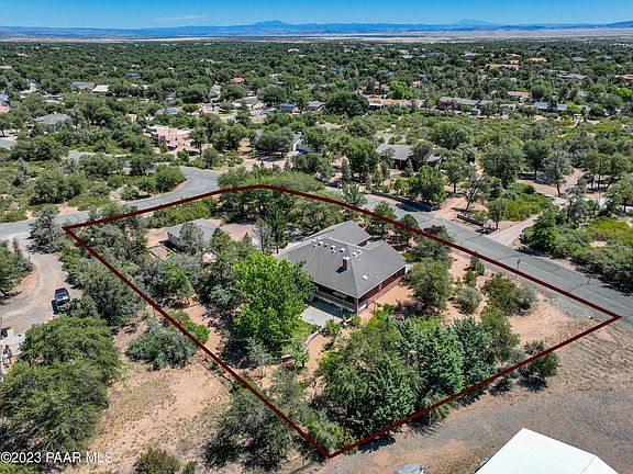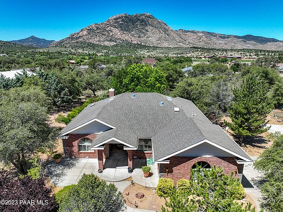 Welcome to this charming brick home with great bones, located in the desirable neighborhood of Royal Oaks. It's just 10 minutes from downtown Prescott. This 2063 sq. ft. 4 bedroom, 2-bathroom, 5 car garage residence is nestled on .93 acre in a peaceful neighborhood with lots of trees. The combination of the breathtaking views of Granite Mountain and the presence of mature pinion pine trees creates an ambiance of natural beauty and tranquility that is truly unparalleled. Upon entering, you step into a spacious light-filled main living area that includes beautiful hardwood floors. The open floor plan seamlessly connects the living room, dining area, and kitchen with a breakfast bar. This home has several fantastic features.