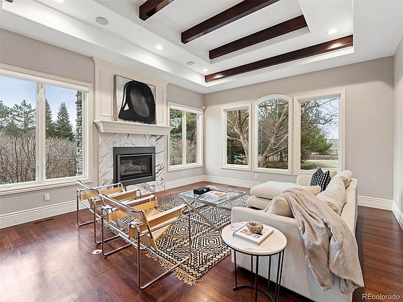 Set in a gated community on a quiet cul de sac, Polo Ridge Mansion offers French country living with beautiful details and upgraded amenities. The 6,870-square-foot home sits on a nearly 1-acre property that backs up to walking trails and a lake. Enjoy Colorado’s amazing year-round weather from the sun room or expansive patio, which features several entertainment spaces, a pergola and an outdoor fireplace. Inside boasts plenty of room for hosting friends and family while also offering moments of tranquility. The main level features a mudroom, ½ bathroom with Gucci tiger print wallpaper, fireplaces in the two living spaces, a dining room and a modern kitchen. The kitchen, designed by EKD designer Mikal Otten, is meant for hosting. There are 2 dishwashers, Wolf and Sub-Zero appliances, a custom range hood, a breakfast nook and an oversized Carrera Marble island. Upstairs spans 4 bedrooms and 4 bathrooms, including a large primary suite with a fireplace, sitting area, 5-piece bathroom with marble features, walk-in closet and private balcony perfect for viewing Colorado’s colorful sunsets. The finished basement has two additional bedrooms, a media space, storage and modern wet bar with bar seating. Recent upgrades to the home include new mantles and tile on all fireplaces, upgraded backsplash in the kitchen, a remodeled master shower, 2 new water heaters, the main water line and the custom mudroom. There’s also a surround sound system throughout. 7630 Polo Ridge Drive is conveniently located near local shopping and eateries in downtown Littleton with easy access to downtown Denver.
