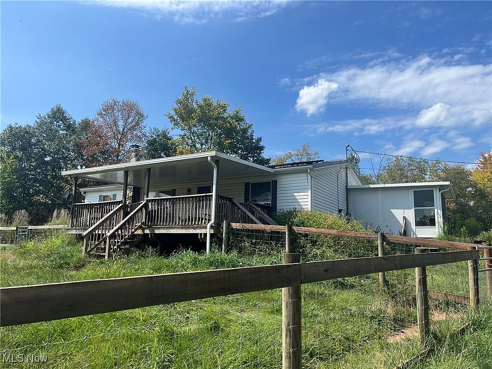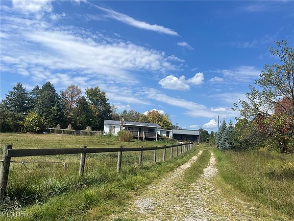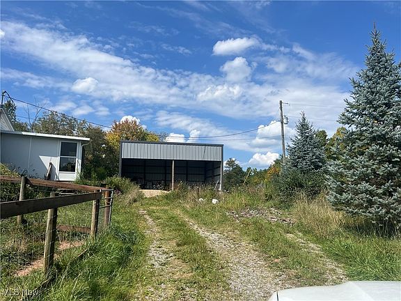 Beautiful country setting for this mini horse farm consisting of a 2001 doublewide, a detached open front 2 car garage, & a fenced yard for horses on 5 acres just north of Kimbolton and Salt Fork State Park. Home has 3 bedrooms, 2 full baths, cathedral ceilings, covered front porch overlooking the countryside, back enclosed porch, newer metal roof & newer propane furnace & air. All appliances currently in home stay but wood burner does not stay. Home is siting on a full brick foundation. There are solar panels on roof which helps reduce the cost of electric bills. Seller does not own mineral rights. High Speed internet is Spectrum. Home is in need of some TLC & will not go government financing. There are 2 water wells on the property & a septic with leach field. The chicken coop doesn’t stay.