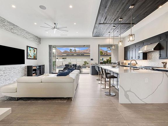 Welcome to your dream desert escape! Nestled on a coveted corner lot in prestigious Indian Wells, this custom-built 4-bedroom estate is the epitome of modern elegance and seamless indoor-outdoor living. Backing up to the base of the breathtaking Santa Rosa Mountains, this home offers unparalleled panoramic views and ultimate privacy. Step inside to soaring 12' ceilings, an open-concept floor plan, and high-end finishes throughout with large format tile throughout the house, courtyard and rear patio, along with a custom accordion sliding door and window off the great room create a stunning transition to the resort-style backyard, where you'll find a custom pavered patio, pool, spa, firepit, and a fully equipped outdoor kitchen--all designed for effortless entertaining. Stay comfortable year-round with a misting system and patio heaters, while the sleek stacked stone indoor and outdoor fireplaces add ambiance. The chef's kitchen is a masterpiece, featuring a massive quartz waterfall island, dark toned shaker cabinetry, professional stainsteel steel Dacor appliances, custom light fixture and a walk-in butlers pantry. The adjacent custom wet bar offers the same high end finishes, and whole-home surround sound system elevate your hosting experience. Each of the 4 en-suite bathrooms as well as the powder bath and full outdoor bathroom offer matching quartz countertops and custom tile accents exuding modern sophistication. The primary suite is a private sanctuary, boasting a built in desk space, plus a gorgeous en-suite bath with a luxurious soaking tub, glass-enclosed steam shower, and dual vanities with ample cabinetry and two spacious custom closets, one with in-unit laundry. Additional highlights include a three-car garage, energy-efficient owned solar system containing 23 panels, and meticulously designed landscaping. Experience the best of Indian Wells living without an HOA--where contemporary luxury meets the beauty of the desert.