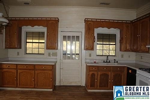 Very private 4 acres with large home; several out buildings. Nice covered porch. Some hardwood and vinyl flooring. Bay window in kitchen which has lots of cabinets, gas stove.