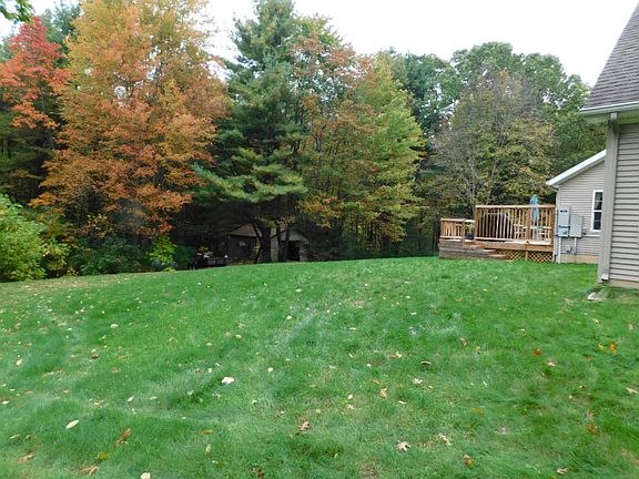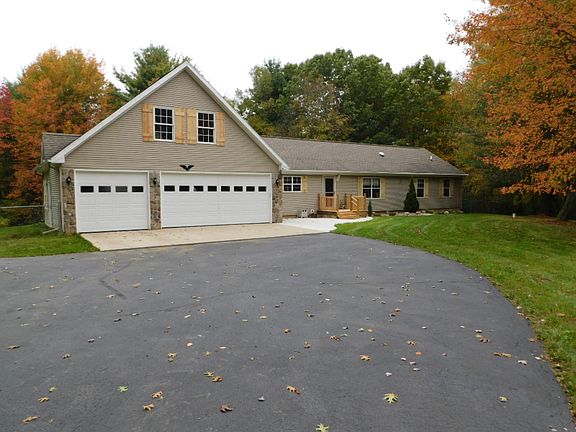Over 10 beautiful, private, wooded rolling acres w/1 acre area fenced in for pets. 3 Bdrms, 2 full baths & a partially finished full walk-out basement which is plumbed for a 3rd full bath. The Master suite has a large walk-in closet, full bath w/dbl sink vanity, & sliders out to the beautiful 60' deck overlooking a spectacular view of the woods. Large open kitchen . It boasts a lovely stone gas fireplace, neutral colors throughout (carpeting, paint & ceramic tile). It features a new furnace, paved driveway, doubled paned tilt out windows, 200AMP elec. & a separate 100AMP service in the extremely large 3 car heated att garage w/add 14x24 partially finished upstairs. There is also a 16x24 pole barn w/concrete & 110 v elec.
