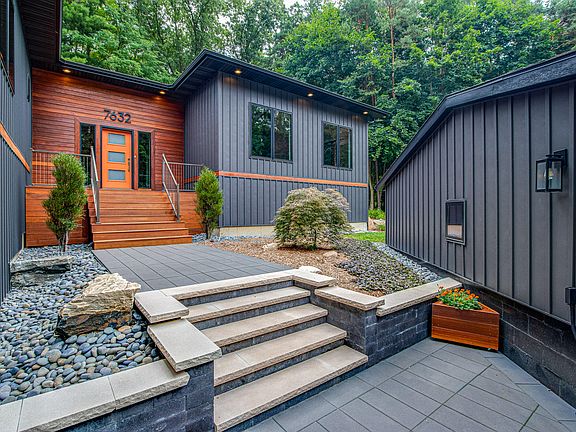 Natural beauty and modern design abound in this private wooded retreat, nestled amongst 2+ acres of towering trees, lush greenery, beautiful landscaping and a private pond. This exceptional home boasts more than 4400 sq ft of modern finishes and a spacious airy open floor plan w/12-foot ceilings, seamlessly blending style, comfort, and functionality. Experience the perfect synergy between living spaces, creating an inviting atmosphere ideal for entertaining and everyday living. Notice the captivating floating pan ceiling, a crown jewel of the living area, showcasing intricate design and concealed lighting that sets a sophisticated tone while adding depth and dimension to the space. Large windows bring the outdoors in, allowing you to enjoy breathtaking views of the changing seasons while providing abundant natural light. The custom kitchen includes a 10-foot island which opens up to a linear gas fireplace and multiple living spaces, including a built-in reading nook. The primary suite features a spa-like bath with slipper soaking tub, standard and rain shower heads, plus a large walk-in closet. The main floor also offers a guest suite w/private bath, 2 bedrooms, plus 1 full and 1 half bath. The lower level adds a family room, 5th bedroom, laundry, bath and pet spa. Other amenities: smart home technology, Pella fiberglass windows, Invisible Fence underground dog fence, TruCedar board and batten siding, exotic Kayu Batu decks and accents, Kohler home generator, and bonus 3-stall detached garage in addition to the attached 2-stall garage. Adjacent to the Cascade jogging/bike path. Minutes away from downtown Ada in the Forest Hills School District.