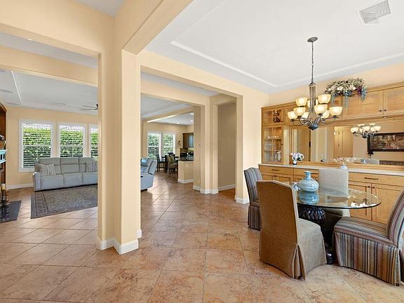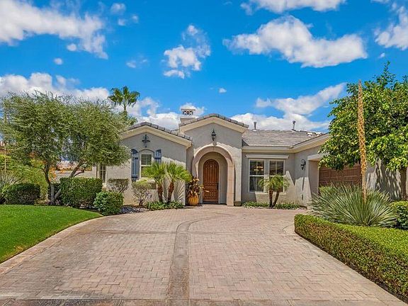 Welcome to Montelena, a very sought after development in the heart of Indian Wells! This 3 bedroom, 3.5 bath home is anopen floor plan, easy for entertaining. Upon entering this lovely home, you will notice the open and airy dinning room with custom built ins. Thecabinetry features glass shelves with lights to display your treasured pieces all behind glass panel doors on the upper section of the buffet. Straightahead, you will enter the great room also with custom designed and built in cabinetry that surrounds the fireplace. These custom cabinets alsohave shelves with lights and ample storage area in the cabinets below. The gourmet kitchen features dark rich cabinets, slab granite counters anda walk in panty. Double ovens, microwave and side by side refrigerator all in stainless steel. Dining is available with island counter seating as wellas a breakfast area. The two guest bedrooms are separate from the main suite for complete privacy. Both guest bedrooms are en suite and havewalk in closets. The main suite has a rotunda entry, a large walk in closet, duel sinks, tub and separate shower. The main suite also has access tothe back patio. The flooring in the home is tiled throughout and beautiful wood floors in all three bedrooms. Access to the covered patio with stoneflooring is created from the main suite and kitchen. Separate laundry room opens to the garage .The spacious two car garage has beautiful epoxy paint flooring