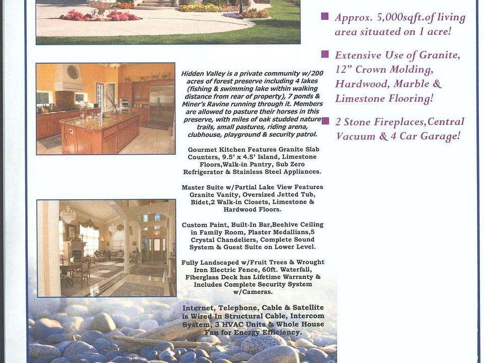 Only $154 per Sqft. for this gorgeous custom home in the Hidden Valley community in Granite Bay. This elegant house features cathedral ceilings, 60 ft. marble entry, limestone, and hardwood floors. Granite counters in kitchen and baths. Gourmet kitchen with huge island, walk-in pantry, and 5 burners gas stove. If has 5 brs, an office, and 3.5 ba. The guest quarters is on the 1st flr. The relaxing master suite has jetted tub and seating area. This hm is part of a 180 acre comm. with private lake. Neighborhood Description Excellent neighborhood