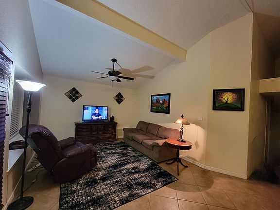 The desert landscaped back yard with a covered patio is perfect for outdoor entertaining and dog friendly for both large and small dogs. Enjoy this home with high ceilings and beautiful windows that make this home bright. This home comes with ceiling fans and window coverings.