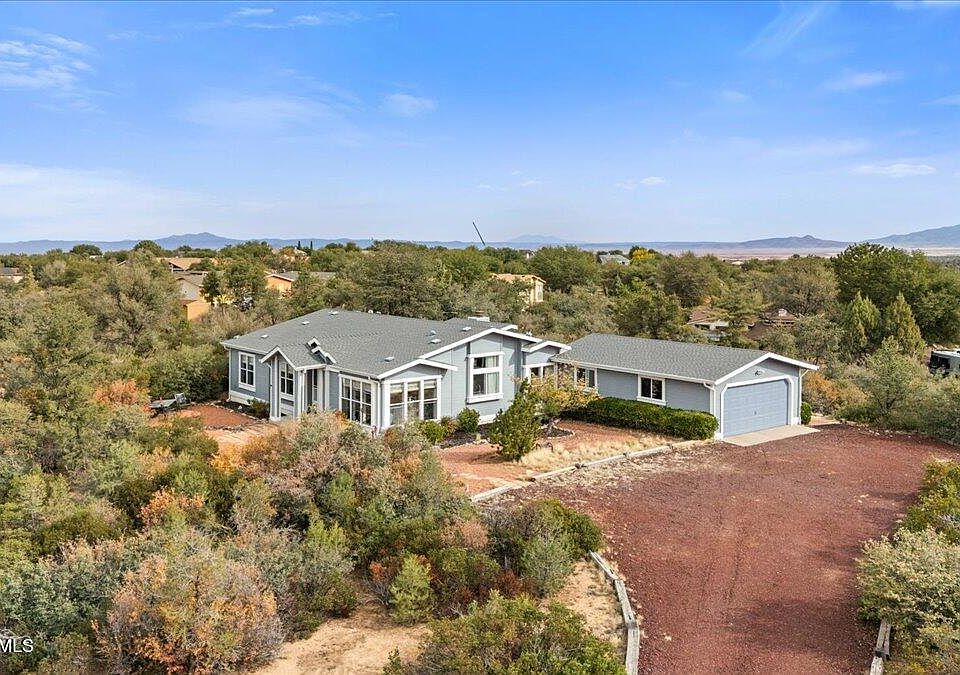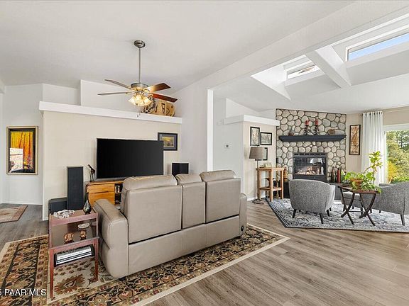 Set within the sought-after Royal Oaks neighborhood, this beautifully updated single-level, triple-wide contemporary manufactured home sits gracefully on a private and spacious .81-acre homesite. The modern exterior is inviting, surrounded by mature landscaping and natural vegetation that create a sense of serenity and seclusion from the moment you arrive.Enter to find a bright, open interior highlighted by soaring ceilings and distinctive architectural lines that make a lasting impression. The open-concept living area blends comfort and design, beginning with the great room that encompasses both the living room and kitchen. A cozy gas fireplace anchors the space, while a newer sliding glass door floods the room with natural light and opens to the outdoor living area. The kitchen, seamlessly integrated into the great room layout, is a showpiece of the home. Completely remodeled in 2022, it features gleaming quartz countertops, stainless steel appliances including a five-burner propane range, and a large center island with pendant lighting and breakfast bar seating. An oversized window above the sink frames an inspiring view of Granite Mountain, offering a peaceful backdrop to everyday routines. A quaint breakfast nook sits nearby, ideal for casual dining. Located off the foyer, the formal dining or sitting area is the perfect place to begin your day or entertain guests, framed by beautiful views of Granite Mountain at sunset.The primary suite is a private retreat with generous proportions and its own newer sliding glass door leading to the backyard deck. The ensuite bathroom was recently refreshed with a stunning floor-to-ceiling tile shower, dual vanities, a dressing table, and a linen closet creating a spa-like atmosphere. Two additional bedrooms, each with sliding door closets, provide comfort and flexibility for family or guests. The second full bath includes a solar tube for natural light and a combination tub and shower.Conveniently located off the kitchen and breakfast area, the laundry room is efficiently designed and connects directly to the 2.5-car garage, deep enough to accommodate a workshop or space for hobbies.The backyard is a true sanctuary. The engineered deck offers a peaceful place to enjoy the quiet surroundings, while natural vegetation provides privacy and shade. Tucked just beyond the deck lies a charming 'secret garden,' perfect for moments of reflection while gardening or enjoying nature.Notable improvements include new sliding glass doors and select windows (2015), roof and gutter replacement (2019), full kitchen remodel (2022), new flooring (2022), master shower replacement (2024), floor leveling (2025), tankless water heater (2008, serviced 2024), fresh interior paint (2023), and exterior paint (2017). Every update reflects pride of ownership and attention to detail--making this home not only move-in ready but truly exceptional.