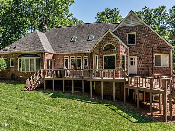 Welcome to this exquisite brick estate on 3 serene acres in Wake Forest, free from HOA and city restrictions. The grand circular driveway and expansive back deck overlooking a secluded backyard make this home perfect for relaxation and entertaining. This elegant ranch-style home features a seamless open floor plan with beautiful hardwood floors. Enjoy various living spaces including a sophisticated study, family room with fireplace, and formal dining room. The owner's retreat is a sanctuary with a charming bay window, vaulted ceilings, and direct deck access. The kitchen boasts a gas range, granite countertops, tile backsplash, and a Butler's pantry/laundry room. The opposite wing of the main floor houses two spacious bedrooms connected by a Jack-and-Jill bathroom. Upstairs, find a versatile bonus room and two expansive walk-in attic spaces for abundant storage. The property also includes a vast unfinished basement with a wine cellar that is connected to the oversized 2-car garage. Lots of possibilities for hobbies, a workshop area, and more. The home includes a whole-house Generac generator on standby for seamless automatic transfer. Designed for those who appreciate privacy, space, and an unencumbered lifestyle, this estate is a rare find. Embrace the opportunity to own this distinctive property and experience the best of Wake Forest living. Close to Falls Lake, Zinchouse Winery, golf, shopping, and dining!