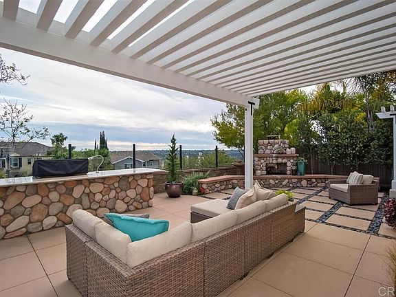 Gorgeous, recently updated La Costa Oaks home on elevated view lot--remodeled w/high quality finishes throughout--newer kitchen, baths, flooring, lighting--owned solar w/24 panels. Indoor-outdoor living w/lg. private courtyard w/fireplace, solar heated pool & spa w/beautiful views, BBQ, 2nd outdoor fireplace--great entertaining home w/public rooms open to courtyard & back yard. Gorgeous sunset views! Versatile floorplan w/great room, sep. family room off kitchen, one BR/BA down, master w/view balcony