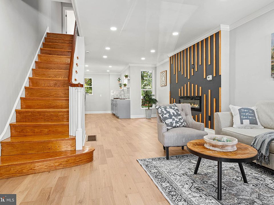Electric fireplaceWalkout basementSun-drenched living spaceOpen-concept layoutBeautiful cabinetryModern accent wallLaundry facilities