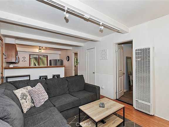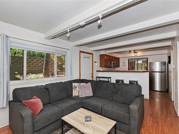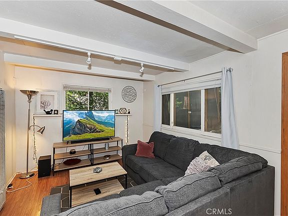 BRAND NEW ROOF AND EXTERIOR PAINT! This Crestline Village home is super cute and ready to move in. The welcoming living room provides a relaxing atmosphere, while the well-appointed remodeled U-shaped kitchen is ideal for preparing delicious meals, and is equipped with updated stainless appliances. The bathroom is in between the two bedrooms. One bedroom has a double patio door to the large deck which provides plenty of natural light. From the private back deck you can enjoy the view of the breathtaking trees this neighborhood is known for. The partially-fenced-in yard is perfect for pets, gardening, or outdoor activities; the fence does not encompass the entire property line and there is potential for more space to utilize in this larger lot. There is a large build that offers additional storage. The washer and dryer (included in the sale) is located in an attached room on the side of the house. **In 2024 the exterior of the house & deck were repainted an attractive shade grey, and the roof was replaced with high-quality materials to ensure this property lasts many years to come. There is off-street parking for 2 vehicles. There is also an additional storage shed in front of the house that matches the exterior paint. This property is perfect for buyers seeking comfort and convenience, and is the definition of an ideal commuter location! Come take a look.
