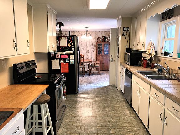Ranch style home on approx. 7.63 acres. Windows & baths updated. Living room opens to dining area. Large galley kitchen w/ storage area off kitchen. Dining area off kitchen opens to back deck/pool area. Barns, Storage building & workshop barn with power & bathroom are all sold "as is". Deer blinds & deer stand convey. Deer feeder & curtains do NOT convey. Lots of wild life. Owners have cleared a lot of the area, yet leaving plenty of wooded area for wild life. Agent saw deer while taking pics.