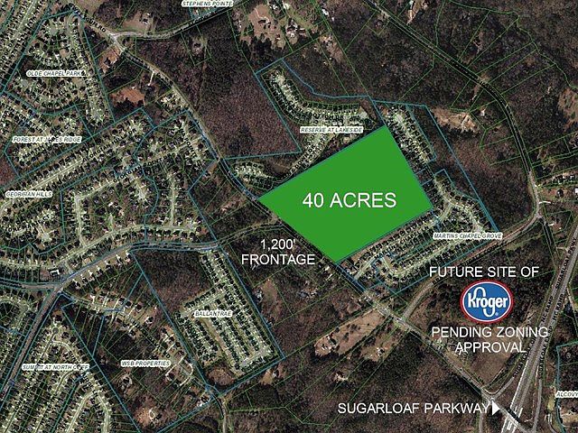 Prime, uninterrupted land in Lawrenceville, perfect for new community development. Located a half mile from Sugarloaf Parkway and the soon to be developed 40-acre Kroger shopping center and 3 miles from SR-316. 1,200 Feet of Martins Chapel Road frontage and surrounded to the rear and sides with existing residential communities. Parcels include assemblage of 6 family owned lots totaling 40 acres. Land may be accessed from the Simonton Road and Martins Chapel Road intersection. Acreage is partially wooded and level. Public sewage, water and utilities.