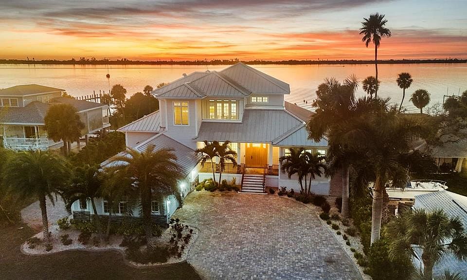 Overlooking the shores of Lemon Bay, this stunning two-story waterfront home delivers the ultimate Florida lifestyle with direct Gulf access and incredible west-facing sunset views. Set on a rare 1-acre lot, the home features soaring ceilings, and an open-concept layout designed to capture the beauty of the bay from every angle. Offered fully furnished, this property is truly move-in ready. Ceramic tile flows throughout, while the gourmet kitchen is equipped with a huge walk in pantry, top-of-the-line Thermador appliances and massive 7 by 8 ft island with plenty of space for gathering and entertaining. Every room, including all bedrooms, enjoys expansive water views, creating a constant connection to the serene surroundings. The primary suite is a private retreat with his-and-hers walk-in closets and a spa-like bath featuring a luxurious garden tub. Upstairs, an en-suite bedroom opens to a private balcony—perfect for morning coffee or evening sunsets. Outdoor living shines with a travertine pool deck, large heated, saltwater pool, hot tub, and a large, electric pergola shading the outdoor kitchen. A 170-foot dock with a 16,000-lb boat lift, grandfathered tiki hut, make this a true boater’s paradise. Also features hurricane windows & doors with shutters to enclose the back lanai, standing seam metal roof, Hardie plank siding and tons of extra storage. Reach nearby restaurants and shopping by boat, enjoy quick access to Manasota Key and Englewood Beach, and visit the popular farmers market just a mile away. Thoughtful features include a flood-conscious garage design and a 30-amp RV hookup. This exceptional Lemon Bay property blends comfort, functionality, and unforgettable coastal living.
